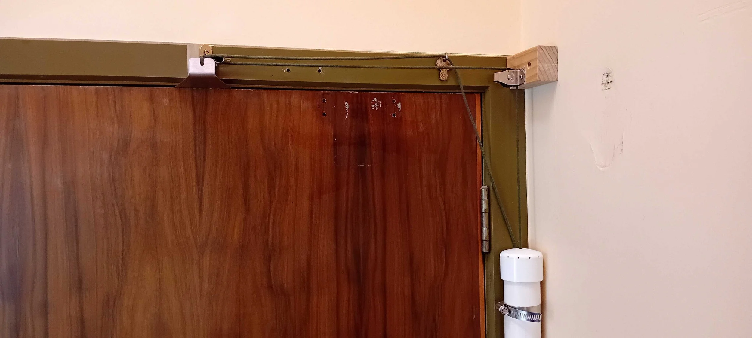 "Here's an automatic door closer I made. It keeps the warm air in the living area. It is a weight, string and pulleys to pull the door closed. The weight is in a pipe with some small holes to restrict the air flow and make it close nice and slowly."
